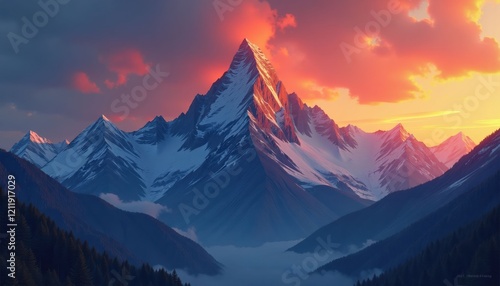 Snow capped mountains with red and orange sunset sky, vast landscape view.
