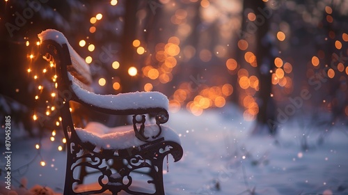 Snow covered bench with yellow glowing lights decoration on tree in winter. The view is peaceful and serene