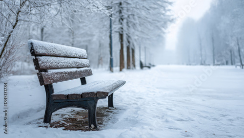 snow, winter, park, bench, landscape, cold, glacé, tree, path, outdoors, nature, season, weather, scenery, scene, tranquil, winterly, snowy, alley, alleyway, row, perspective, mist, fog, foggy, misty, day, daytime, nobody, empty, tree branch, wooden, seat, public, relaxation, rest, calm, quiet, frost, seasonal, atmosphere, background, christmas, new year, holiday