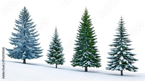 Snow covered pine trees on winter hill with white background and peaceful seasonal landscape