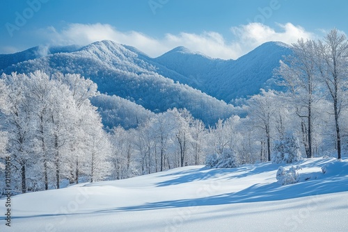 Snow covered trees and mountains creating stunning winter wonderland landscape