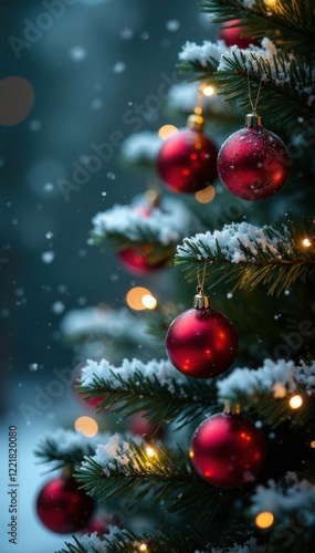 Snow dusted fir tree with red glass ornaments and twinkling string lights, decoration, garland, snowflakes