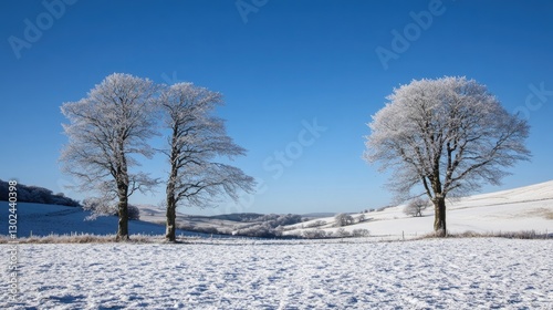 Snow falling against a clear blue sky, creating a contrast between the light snow and the crisp winter air with plenty of copy space.