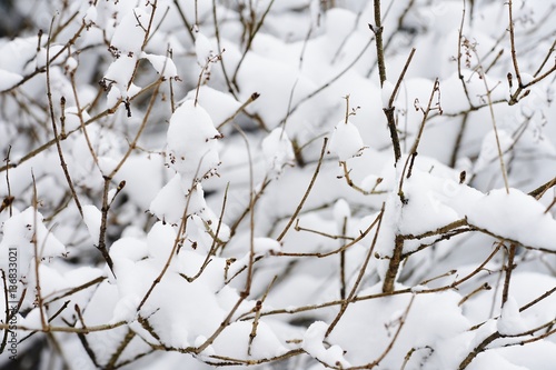 Snow on bare tree branches after a Noreaster blizzard snowstorm
