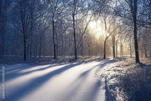 Snow path in winter forest. Evening sun shines through trees
