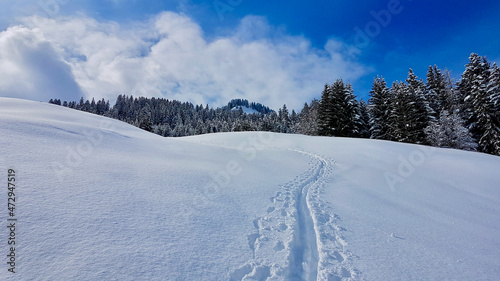 Snow trail in idyllic winter landscape in the Austrian Alps. Vorarlberg, Austria.