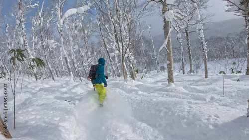 freeride, powder snow, snowboarding, adventure, snowboarder, sport, jumping, backcountry, white, winter landscape, sunny, japan, hokkaido, asia, ski resort, action, freedom, joy, fun, following, adrenalin, extreme sport, outdoors, recreation, holiday, male, man, young adult, rider, experienced, nature, real people, authentic, wilderness, exploration, snowboard