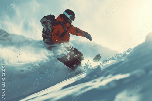 Snowboarder Riding Down Fresh Powder Snow on Steep Backcountry Mountain Slope in Winter Wilderness