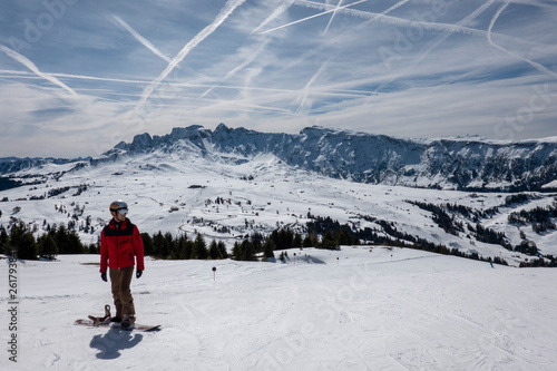 Snowboarder with red jacket in front of Dolomites mountains in Seiser Alm