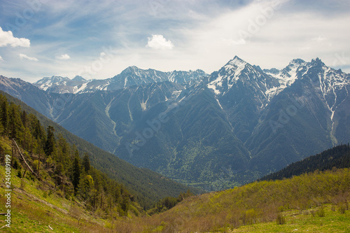 snow-capped mountain peaks against the background of a coniferous forest landscapes of Karachay-Cherkessia in Teberda