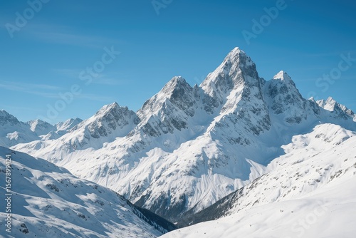 Snow-capped mountain summits under a clear blue sky in winter