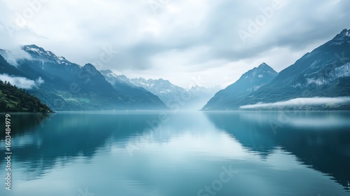 Snow-capped mountains and serene lake landscape with misty clouds and mirror-like water reflection, majestic peaceful scene for wallpapers, digital art backgrounds, or environmental themes