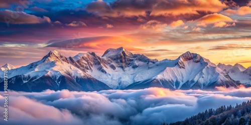 Snow-capped peaks majestically rising above a vast expanse of cloudy skies at dawn with soft pink and blue hues gradually