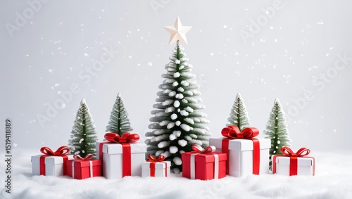 Snow-covered Christmas tree with a star topper surrounded by neatly wrapped red and white gift boxes on a snowy surface with softly falling snowflakes