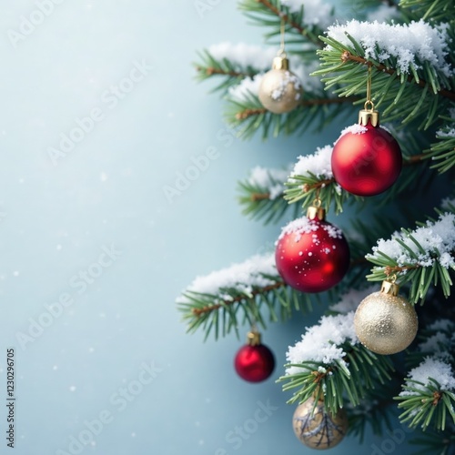 Snow-covered fir branch with festive ornaments, frosty woods, decorative items