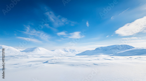 Snow-covered hills and distant mountains under a blue sky with soft clouds, creating a peaceful winter landscape in the wilderness