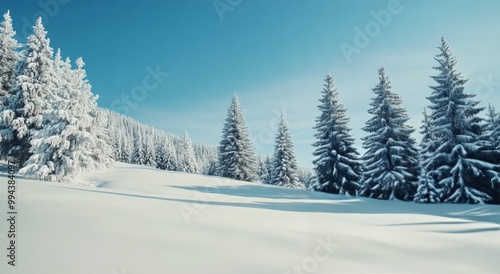 Snow-covered landscape with evergreen trees under a bright blue sky on a clear winter day