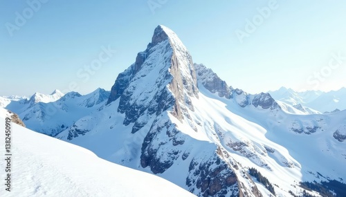 Snow-covered mountain peak, pristine white backdrop, peak, rocks