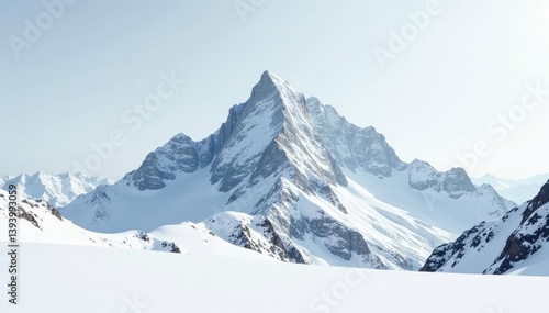 Snow-covered mountain peak, stark white landscape, summit, glacier, cold