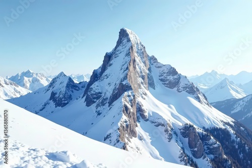 Snow-covered mountain peak, stark white, sunlit texture , peaceful, landscape