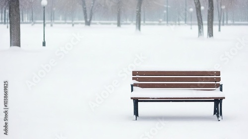 Snow-covered park bench with a peaceful snowy backdrop, serene chill
