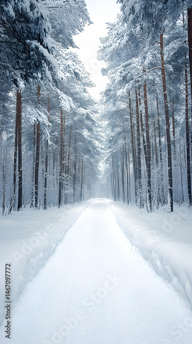 snow, winter, forest, path, tree, pine, landscape, cold, serene, quiet, peaceful, white, icy, glacé, nature, wood, track, road, trail, coniferous, evergreen, branch, trunk, stillness, calm, solitude, mystery, magical, atmosphere, light, shadow, depth, perspective, texture, fluffy, crisp, pure, clean, beautiful, scenic, winter landscape, idylli, picturesque, frost, snowy, coldness, silent, unblemished, untouched