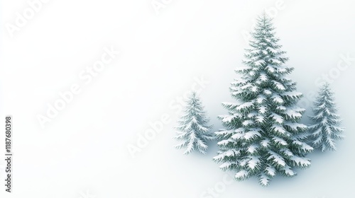 Snow-covered pine trees on a wintery landscape with a soft white background