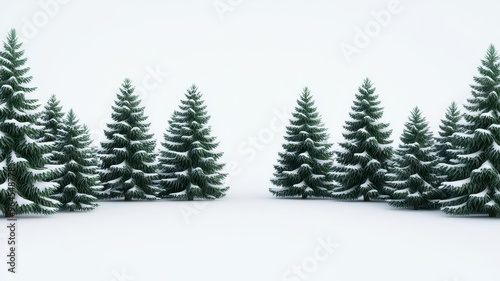 Snow-covered pine trees, serene winter forest, 3D illustration, copy space for text,