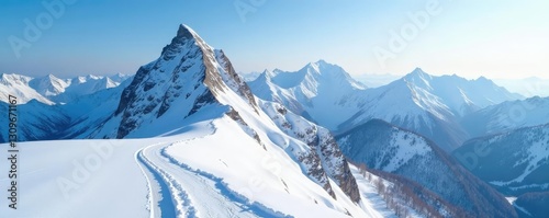 Snow-covered summit peak of ski resort mountain, cold, winter, resort
