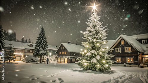 Snow-covered village at night, with glowing lights from windows, a tall Christmas tree in the center of the square, soft snowfall under a starry sky, christmas design background