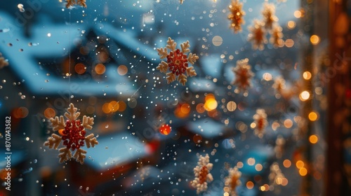 Snowflake decorations hanging on a frosty window with bokeh lights in the background, creating a cozy winter atmosphere.