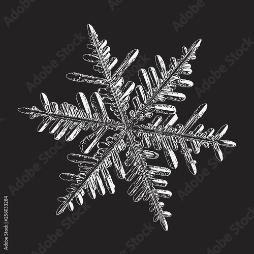 Snowflake isolated on black background. Vector illustration based on macro photo of real snow crystal: large stellar dendrite with complex, elegant arms, ornate shape and glossy, relief surface.