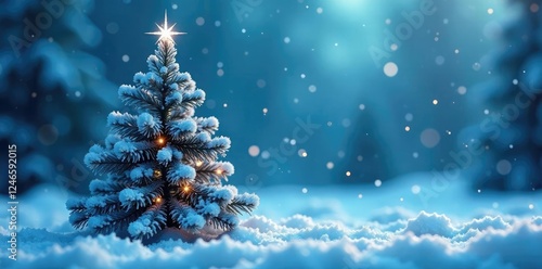 Snowflakes dance around a frozen Christmas tree on a blue winter background, frost, snowflakes