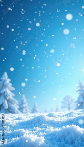 Snowflakes fall from a clear blue sky onto the frosty ground, falling flakes, winter wonderland