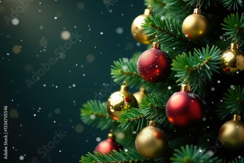 Snowflakes fall gently on a lush evergreen tree adorned with intricately decorated ornaments in gold and red, gold, Christmas
