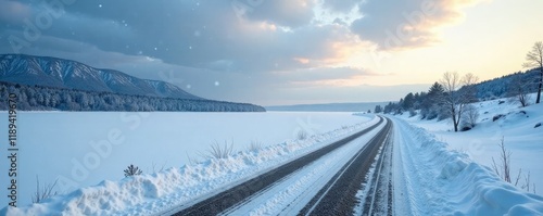 Snowflakes fall on a deserted gravel road on a frozen lake, desertion, serene landscape, snow