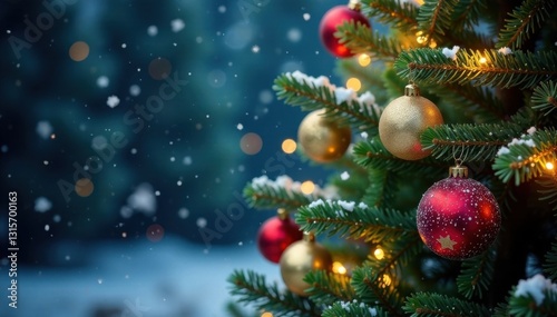 Snowflakes gently falling on a decorated Christmas tree , christmas, winter, season
