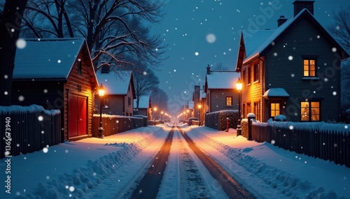 Snowflakes gently falling on a quiet village street at night, night sky, winter evening