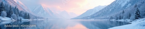 Snowflakes gently falling on a serene winter landscape, frosty mountains, snowflakes soft pastel colors winter landscape serene peaceful calm frozen lake