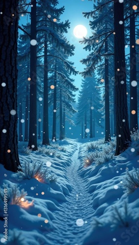 Snowflakes gently falling on the forest floor under moonlight, frostyforest, snowflakesswirling, forestfloor