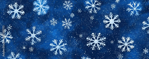 Snowflakes in various shapes and sizes scattered across deep blue background create serene winter atmosphere. delicate patterns evoke sense of calm and beauty