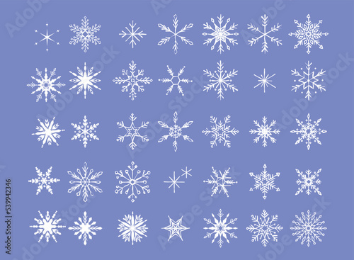 Snowflakes set. Snowflakes collection for design Christmas and New Year banner and cards. Winter set of white snowflakes isolated on purple background. Vector illustration