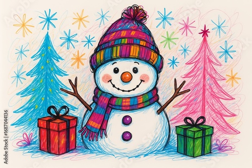snowman, frosty, snowman, christmas, christmas, winter, present, gift, tree, colourful, scribble, chaotic, wax, wax crayons, crayons, drawing, style, doodle, freehand, sketching, hand-drawn, children, children, design, art, colours, vignetting, chalk, set, cartoon, grunge, cute, background, white, graphic, funny, fun, childlike, many-coloured, many-coloured