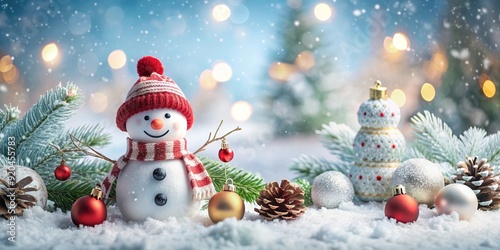 snowman surrounded by Christmas decorations and winter landscape, snowman, Christmas tree, snowflakes, holiday, festive
