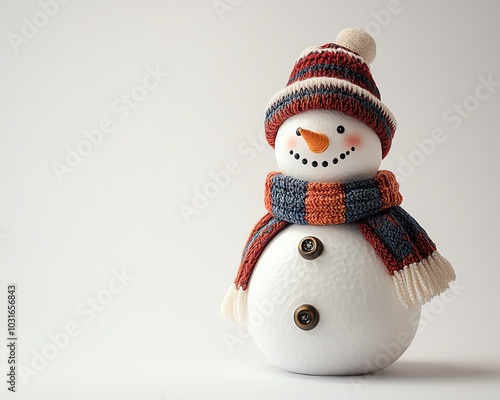 Snowman wearing a colorful hat and scarf on a white isolated background