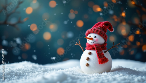 Snowman with red hat and scarf in snowy winter scene with warm glowing lights
