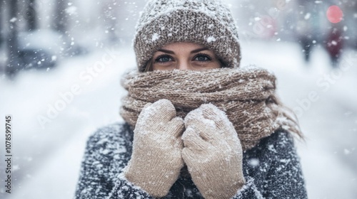 woman, snow, winter, portrait, cold, fashion, glove, hat, foulard, girl, freezing, frost, snowy, weather, outdoors, season, nature, photo, human, person, casual attire, street, city, urban, closeup, female, eye, face, beautiful, style, cute, adorable, elegant, happy, day, white, grey, background, sharpened, light, model, posing