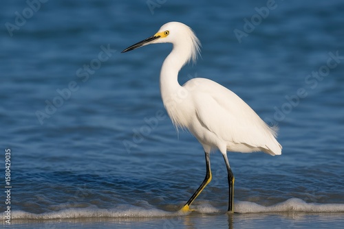 Snowy Egret wading in calm blue waters with gentle waves at its feet