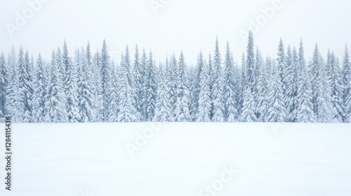 Snowy forest, serene winter landscape, snow-covered trees, tranquil nature scene, ideal for winter themes, peaceful atmosphere