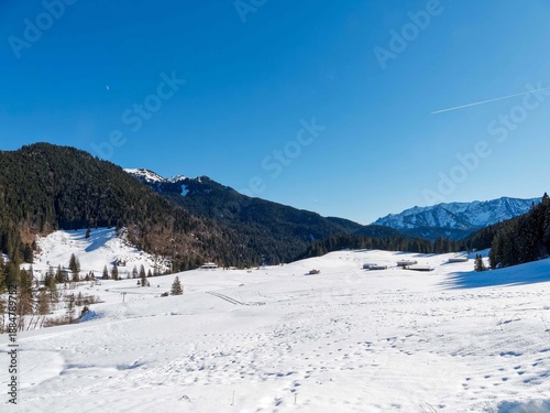 Snowy landscape around Spitzingsee in Bavarian Alps. Valley and Rote Valepp river at the bottom of slopes of the Schwarzenkopf and the wild forest reserve from the Rosskopf trail